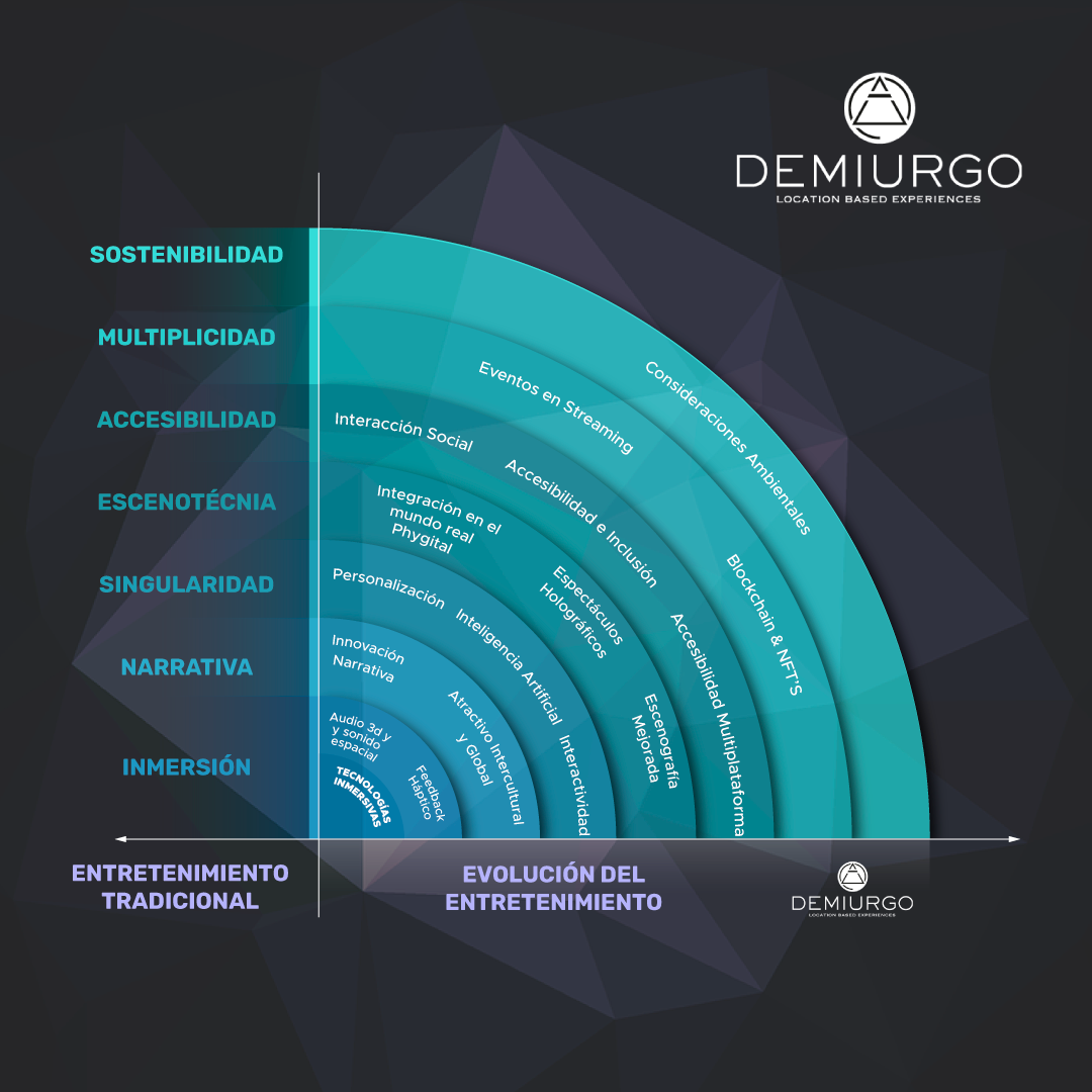 Estos elementos y otros más reflejan un panorama del entretenimiento dinámico y en rápida evolución a medida que la tecnología avance y se generen nuevos espacios innovadores (Leer también DEMIURGO desarrolla dos nuevas atracciones inmersivas en Aztlán Parque Urbano que crearán una nueva forma de entretenimiento en México - Demiurgo) en los que las mentes creativas como las de Demiurgo sigan experimentando con nuevas combinaciones de estos elementos, como el espacio interactivo multisensorial de realidad mixta en donde el tequila Maestro Dobel cobró vida en un recorrido extraordinario por 5 salas y los visitantes vivieron y degustaron la maestría tequilera en todas sus formas.